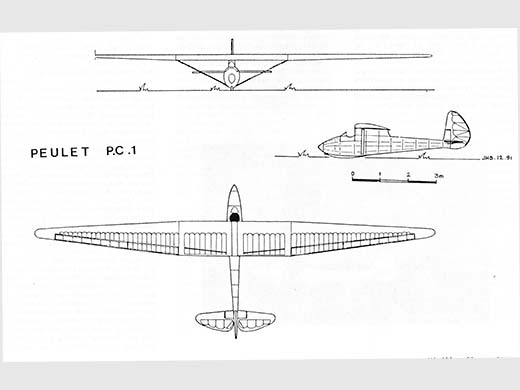 | Histoire résumée | Dès juillet 1933, Henri PEULET dessine le PC-1. Construit par les membres du Club Aéronautique de Créteil, le financement ayant été possible grâce à une importante participation de Charles GIROD. Au mois d'août 1934, à la Banne d'Ordanche, Charles GIROD est responsable de la mise au point et des essais du nouveau planeur du Club Aéronautique de Créteil, affublé par les stagiaires du surnom de "Bigorneau" (ou "Bigornot"), mais il n'est pas très satisfait de son comportement. Après avoir réalisé un certain nombre de glissades et de petits vols d'essai, il se plaint de grondements, vibrations, battements d'empennages et juge ce planeur difficile à piloter. Le mercredi 12 septembre 1934, désireux de rejoindre NESSLER qui évolue sur la pente avec l'AVIA 41 P, pour comparer les performances des deux machines, il se fait lancer au treuil. Mais au décollage le revêtement d'une aile s'arrache (le planeur avait précédemment subi un choc au bord marginal d'une aile et la réparation n'avait pas été faite), le planeur part en autorotation et s'écrase sur une aile. GIROD, la cheville brisée, est transporté à l'hôpital à Clermont-Ferrand. Le planeur sera abandonné sur place, sa réparation paraissant de peu d'intérêt. | ||||||