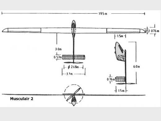 | Histoire résumée | Ultra-léger à propulsion humaine. En exposition au Deutsches Museum Oberschliessheim. Musculair 2 is a muscle-powered aircraft. In 1985 it set a world record for this special aircraft type, flying an average speed of 44.26 km/h over a 1.5 km course at Schleissheim. Holger Rochelt, the designer’s then 19-year-old son, made two record-setting flights on October 1–2, 1985. Musculair 2, by Günther Rochelt (1939–1998), an improved version of the record-setting Musculair 1, which is exhibited at the main Deutsches Museum in Munich. Musculair 2 is lighter and more streamlined than its predecessor. Among the improvements making possible the plane’s extremely light but sufficiently sturdy design was the use of modern materials such as carbon fibre composites and, in the case of the wing, fibreglass/foam sandwich panels. | ||||||