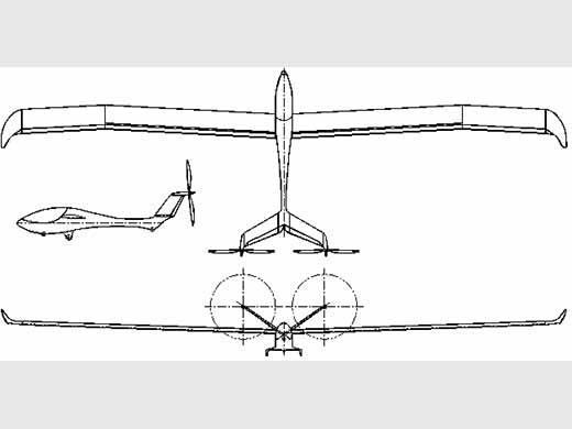 | Infos techniques | Empennage en V. Les deux moteurs électriques sont montés à l'extrémité des deux dérives. Hélice propulsive. | ||||||