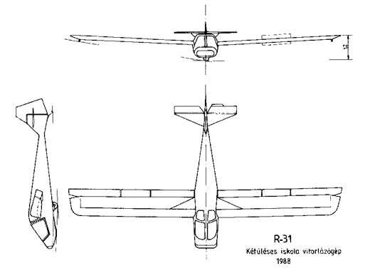 | Histoire résumée | The R-31 Dupla was designed by Ernõ Rubik, who had been retired for years at the time of the design work. His intention was to create a cheap, light, basic instruction glider, which could be the successor of the phaseing out R-26s Góbé gliders. The structure was designed for permissible load factors of +5,3/-2,7.