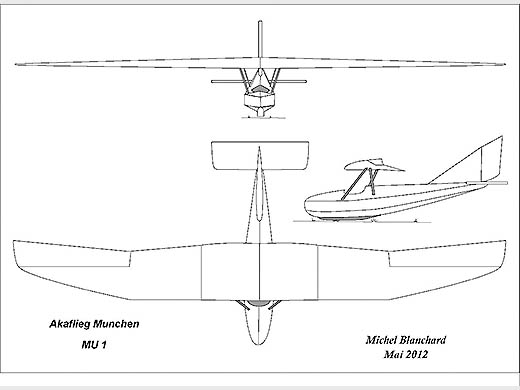 | Histoire résumée | Premier projet de l'Akafliegergruppe München, planeur monoplace de type parasol à coque d’hydravion, qui fut testé sur le lac Ammersee en 1924, tracté par un bateau à moteur pour le lancement. | ||||||