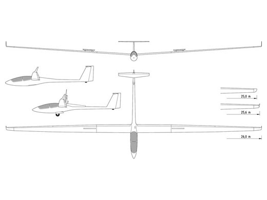 | Infos techniques | Empennage en T. L'envergure fut augmentée dans les dernières versions à 25,6 puis 26 mètres avec des winglets. Une version turbo fut développée, le ASH-25E, suivie par une version à décollage autonome, le ASH-25Mi avec un moteur Wankel et une grande hélice rétractable. | ||||||