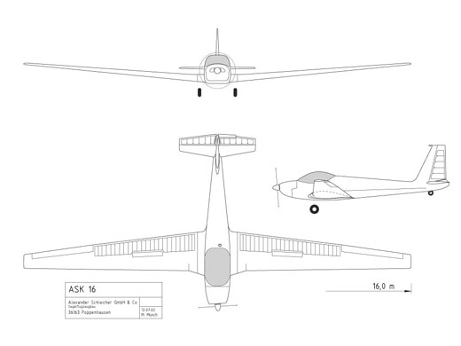 | Liens WEB | Site : Alexander Schleicher . ASK 16. (CL 2024-05-27) Site : Scale Soaring UK . Présentation + photos + plans 3 vues. (2024-05-27 CL) Site : Richard Cawsey . Liste de production de l'ASK-16. (2024-05-27 CL) Site : Horizon Hobby - Modell Aviator . Alles zur ASK-16, article et dessins de Hans-Jürgen Fischer. (2014-09-27 CL) Site : Aviation safety network . . (2024-05-27 CL) Site : Eufar . ASK16 - FUB (Freie Universität Berlin, Institut für Weltraumwissenschaften). (2024-05-27 CL) |