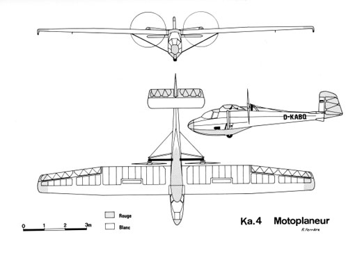 | Histoire résumée | Ka-4 motorisé par un moteur Wolkswagen 1600 cc de 40 CV (occupant la place arrière de l'appareil), entraînant deux hélices placées au bord de fuite de l'aile. | ||||||