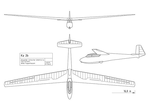 | Histoire résumée | En 1955, le célèbre pilote suisse Willi Baur a convaincu A. Schleicher d'augmenter l'envergure du Ka-2. Une machine hybride (nouvelle aile de 16 m sur fuselage de Ka-2, HB-535) fut livrée à Willi Baur, puis un nouveau fuselage fut construit pour la version de série Ka-2B. Le HB-535 a encore volé en 1985 au Jungfraujoch pour la célébration du 50e anniversaire du concours international de 1935. Production par A. Schleicher de 1955 à 1957. Quatre Ka-2B furent aussi construits par des amateurs. Aux Championnats du monde de Saint-Yan (France, 1956) deux pilotes turcs, Auni Yaykin et Ziya Argun se classèrent 7e avec un Ka-2B. En janvier 2002, il y avait 25 Ka-2B en état de vol en Allemagne, quatre en Suisse (HB-535 déjà mentionné, HB-587, 724 et 733), et 10 encore enregistrés en Angleterre. A Fayence (France), un record allemand d'altitude (6907 m) fut établi par Dieter Schmidt et Karl Pummer le 29 janvier 1959. | ||||||
