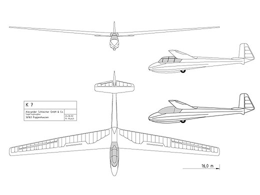 | Histoire résumée | Troisième appareil appelé Rhönadler depuis la création en 1927 de la compagnie Schleicher (après le biplace en tandem d'A. Lippisch Unikat et le monoplace de performance de 1931 de Hans Jacobs). C'est le premier planeur dessiné par R. Kaiser désigné K et non plus Ka (Kaiser ayant changé l'appellation après avoir appris que Ka était dorénavant officiellement réservé au planeur cargo d'Albert Kalkert (datant du début des années 1940). En 2001, 138 K-7 volaient encore en Allemagne, 4 en Suisse, 13 en Belgique et 19 en Hollande. Des K-7 ont été modifiés, en abaissant les ailes en position médiane, leur donnant un air d'ASK-13. Ils sont connus sous le nom de K-7/13. | ||||||||