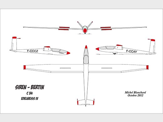 | Histoire résumée | Ce planeur de performance de classe "libre" est dérivé du planeur de classe standard de 15 mètres d’envergure Siren C-30 avec lequel François-Louis Henry remporte le championnat du Monde en 1965. Tous les "Edelweiss" présentent le même type de construction à savoir une forme fine du fuselage avec une position semi-couchée du pilote et un empennage "papillon". |