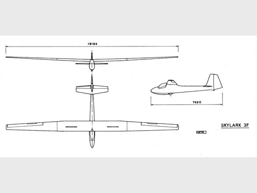 | Infos techniques | Revêtement en contreplaqué du Gabon. Développement du Type 41 Skylark 2, envergure portée à 18 mètres. Les différents types suivants ont été produits : Skylark 3A : première version produite (les specs ci-dessus sont celles de cette première version). 7 exemplaires. Skylark 3B : cockpit avancé de 76 mm, longueur totale augmentée de 80 mm (longueur 7,62 m). Ailerons équilibrés par masselottes. 24 exemplaires. Skylark 3C : 3A avec un longeron d'ailes renforcé pour répondre aux exigences de certification des normes B.C.A.R. et A.R.B [A destination de la Hollande]. 2 exemplaires. Skylark 3D : comme 3B mais avec les modifications du 3C [pour l'Amérique du Nord]. 2 exemplaires. Skylark 3E : version expérimentale du 3B avec un profil NACA 64-2-615 aux saumons, et des ailerons de corde réduite. 1 exemplaire. Skylark 3F : 3B avec une masse maximale portée à 376 kg et quelques modifications : ailerons compensés aérodynamiquement, augmentation de l'envergure de la profondeur de 2,88 m à 3,23 m. Canopy agrandi. 30 exemplaires y compris les kits. Skylark 3G : F modifié avec envergure augmentée, ailerons plus longs et plus étroits. 4 exemplaires. Slingsby T.47 : Projet de Skylark 3 avec des ailes de 20 mètres. | ||||||