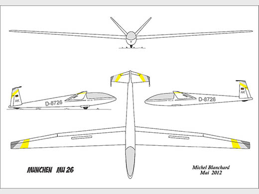 | Infos techniques | Empennage en V. Die Mü26 ist ein Flugzeug mit GfK- Rumpf und Tragflächen in Holzbauweise. Das Pendel–V-Leitwerk zeigt die Verwandtschaft mit der Mü22, wie auch der frühere Projektname Mü22d beweist.