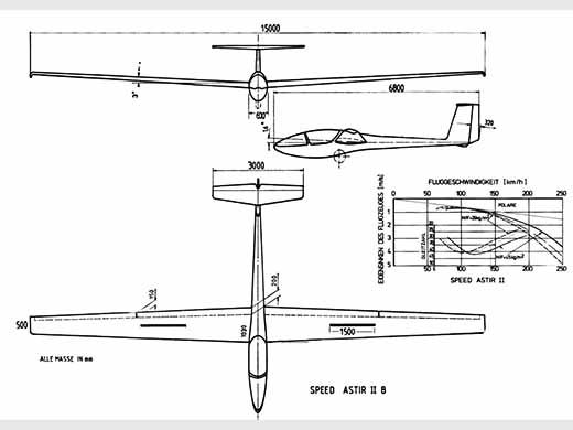 | Histoire résumée | Fin 1979, après avoir construit environ 25 Speed Astir, Grob démarra la production du Speed Astir II, dont le premier vol fut effectué le 11 novembre 1978. Le Speed Astir II avait un fuselage plus fin, à écoulement laminaire, une verrière en deux parties, et des renforcements en fibres de carbone à divers endroits. En octobre 1979, le cockpit fut allongé de 20 cm pour s'adapter à des pilotes de grande taille, et les longerons d'ailes construits en composites de fibres de carbone : c'est la version Speed Astir IIB. A partir de cette même date, il fut proposé la version Speed Astir II 17.5, avec une envergure portée à 17,5 mètres. La production cessa vers la fin de 1979, après la construction de 98 (?) Speed Astir II et IIB [On ne sait pas combien de IIB 17.5 ont été construits]. | ||||||