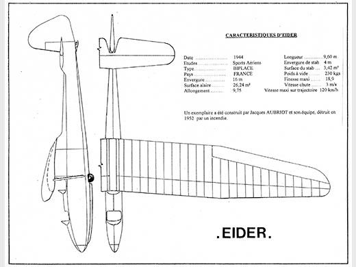 | Histoire résumée | Calculé en 1942 par une équipe du Centre Supérieur d'Enseignement Technique des Sports Aériens d'Aix en Provence et dessiné par Raymond Jarlaud au Parc Atelier central des Sports Aériens à Castelnaudary, ce planeur fut construit clandestinement à Villespy (près de Castelanudary) par Jacques Aubriot et son équipe. A la libération, il fut transporté à la Montagne Noire où il effectua son premier vol le 23 mai 1945. La machine n'effectua que des vols d'essais et ne fut pas homologuée. Elle fut interdite de vol le 6 juin 1949, et fut finalement brûlée fin 1952. | ||||||