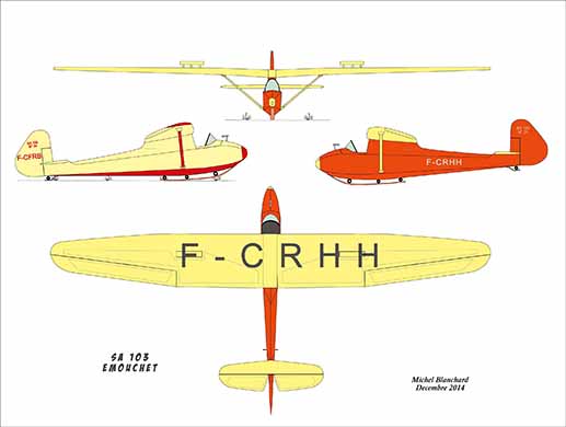 | Livres | Histoire du vol à voile par LACOMBE, R. (1947) [p. 56. Plan 3 vues + specs]. Le planeur SA 103/SA 104 par RAVEL, Christian (2008) [p. 21-52, 93-196. Histoire + Specs + Photos]. Livre entièrement consacré aux SA-103 et SA-104 Szybowiec przejściowy WWS-1 Salamandra par GLASS, Andrzej (2016) [p. 31-34. Texte + 3 photos + plan 3 vues]. Vieilles Plumes n° 18 - Les sports aériens 1944-1950 par GIRARD, Jacques & LERAT, Jacques & MARCEAU, Jacques (2007) [p. 94 - 96. Texte + specs + 3-vues + photos]. |
