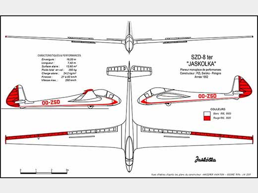 | Liens WEB | Site : Piotr Piechowski . Texte + 28 photos + plan 3 vues + specs. (2009-11-01 CL) Site : Coin de Ciel (Уголок неба) . Texte + 5 photos + plan 3 vues + specs. Lien vers Rétroplane ! (2009-11-07 CL) Site : Scale Soaring UK . La série des Jaskółka. Texte + photos + plan 3 vues + specs. (2012-04-24 CL) Site : Musée de Cracovie (PL) . Notice technique du ZSD-8 ter . (2013-03-20 CL) |
