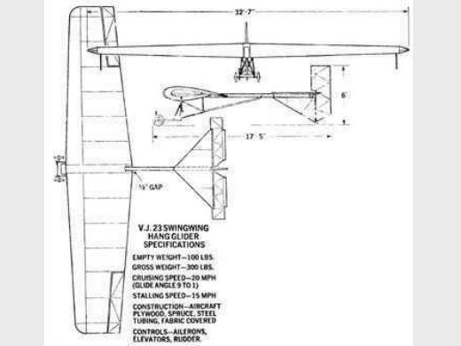 | Liens WEB | Site : Antique Airfields . Note + plan 3 vues. (2010-03-24 CL) Site : Norfolk Hang Gliding Club : David Cook VJ-23 . Vidéo d'une version motorisée. (2010-03-24 CL) Site : Delta Club 82 . Photo. (2010-03-24 CL) Site : Forum Homebuilt Airplanes . Vidéo + plans. (2013-01-13 CL) Site : AirVenture Museum . Note + photo. (2013-04-27 CL) Site : Wikipedia (en) . Note + specs. (2013-04-27 CL) Site : David Cook Aviator . 8 photos. (2013-04-27 CL) Site : Alex Sailplane Directory . Note + photo + specs. (2013-04-27 CL) Site : Flickr . 5 photos. (2013-04-27 CL) |
