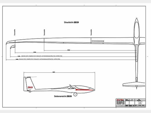 | Infos techniques | Monoplace conçu à partir des ailes de l'EB-28 Edition, avec un fuselage redessiné. Initialement disponible avec des ailes de 28,3 et 29,3 m, des bouts d'ailes donnant une envergure de 25,3 m sont disponibles depuis mars 2011 [les specs données sont celles de la version 29,3 m]. Moteur : Solo 2625/2, bicylindre de 625 cc, puissance 65 CV à 7750 tr/min, réservoir carburant de 33 L. Moteur sur pylône rétractable. | ||||||