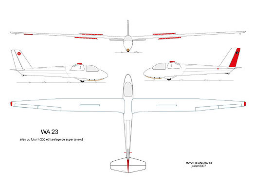 | Histoire résumée | Planeur prototype monoplace de classe libre. Premier vol le 6 août 1962. 1 exemplaire F-CCHQ construit. Le WA-23 a été aux championnats du Monde en Argentine en 1963, comme planeur de remplacement. Basé à Beynes par la suite, il a fait les championnats de France à Moulins en 1969. Par la suite basé à Blois, puis Nevers et enfin Saintes. Il a été déclaré détruit en août 91. Les ailes ont été récupérées par le GPPA à Angers. | ||||||