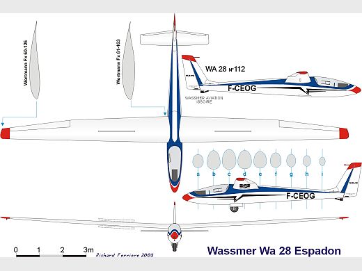 | Histoire résumée | Planeur monoplace de classe standard. Planeur dérivé du WA-26P dont il reprend le fuselage sur lequel est montée une aile en composite. WA 28 WA 28 F : Idem WA 28 sauf atterrisseur fixe WA 28 E : Idem WA 28 sauf aile et fuselage renforcés WA 28 EF : Idem WA 28 E sauf atterrisseur fixe Premier vol en août 1974. 28 exemplaires construits, CN 01 puis CN 91 à 117. Exemplaires encore en état de vol : Environ 15 | ||||||