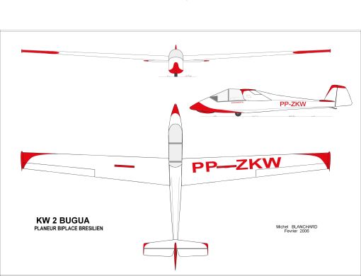 | Histoire résumée | Deuxième design de Kuno Widmaier, après le KW-1, dans le but de fournir aux clubs un appareil sûr et bon marché. Biplace en tandem, il était tout à fait traditionnel dans sa conception et sa construction. Comme pour le KW-1, le nez était au départ trop court, rendant le cockpit trop petit, ce qui fut rapidement corrigé. Le premier vol eut lieu en 1975, sur le terrain du club de vol à voile de Novo Hamburg. Les essais furent concluants et le planeur fut enregistré. Il fut envisagé la mise en production par la firme IPE, mais finalement l'idée fut abandonnée. Le seul KW-2 construit resta en service jusqu'en 2000. | ||||||