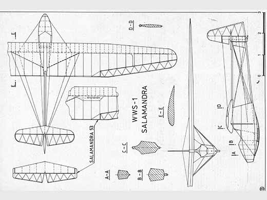 | Histoire résumée | WWS est l'abréviation de "Wojskowe Warsztaty Szybowcowe» (Ateliers de vol à voile militaires) installée à Cracovie (Pologne). L'ingénieur Waclaw Czerwiński prend la direction des ateliers en 1935. Le projet MRP-1 "Salamandra" est le premier projet qui a été créé sous sa direction. Le "Salamandra" était un planeur d'initiation, qui avait d'excellentes caractéristiques de vol, de sorte qu'il a été décidé très rapidement de mettre la machine en production en série. Une série d'environ 150 exemplaires fut rapidement construite. Avant la guerre, le "Salamandra" a également été construit sous licence en Yougoslavie. Après le déclenchement de la guerre, des planeurs furent emportés par les allemands et 4 appareils de l'aéroclub de Lwow tombèrent aussi aux mains des soviétiques. A partir de 1943, le "Salamandra" a aussi été construit en Roumanie. Sur la base d'une copie de la documentation technique cachée des Allemands, le Salamandra fut remis en production après la guerre à Bielsko. Dans les années 1950, le "Salamandra" a été construit en Chine, où une version biplace a été créé. | ||||||||