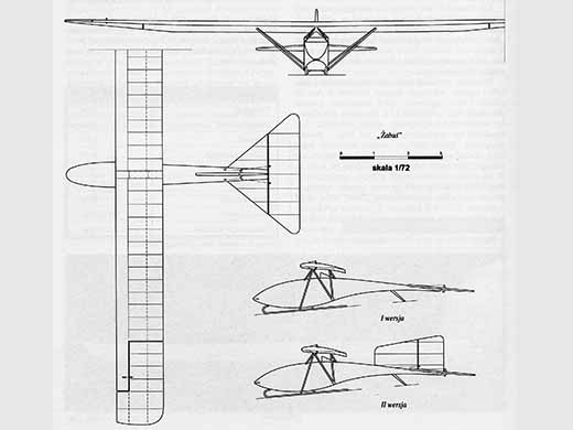 | Histoire résumée | Planeur, construit par le commandant Franciska Jach de Bydgoszcz. Dans sa première version il a participé au concours de 1923. Pendant un vol, après 17 secondes, le planeur eut un accident. La raison en était la complexité des commandes et le manque de lest vertical. Une deuxième version, le "Zabus II", fut construite pour le deuxième concours de 1925 à Oksywie Gdynia. Pendant ce concours le pilote qui était aussi le concepteur, a effectué plusieurs vols de plus de 500 mètres. La machine a été détruite par les Allemands dans le Musée de l'Armée polonais de Poznan en 1939. | ||||||