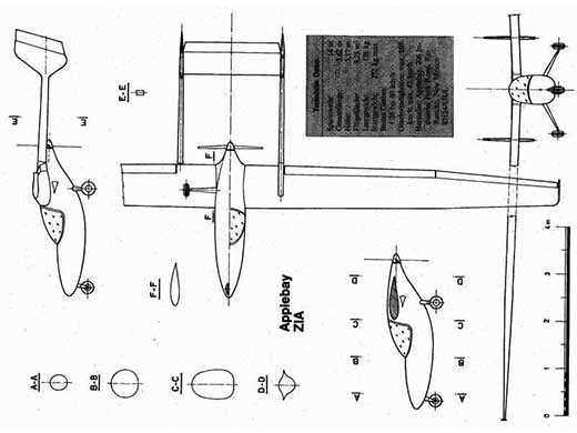 | Histoire résumée | Ce motoplaneur fut dessiné par George APPLEBAY pour le concours de design de la Sailplane Homebuilders Association de 1982. Mais le design fut éliminé de la compétition car le dessin fut modifié pendant la durée de la compétition, ce qui était interdit. En fait le Zia (du nom d'une tribu américaine) est l'aboutissement de 6 configurations différentes, la première ayant été une formule canard. La production démarra à la fin de 1983, le Zia étant prévu pour être vendu prêt à voler ou en kit. Seul quatre exemplaires furent construits, incluant le prototype. Il n'obtint pas de certification, et tous les exemplaires produits furent enregistrés comme "Expérimentaux". En mars 2011, il y avait encore deux Zia enregistrés aux USA, dont celui du designer. Ce dernier est dorénavant en exposition au Southwest Soaring Museum. | ||||||