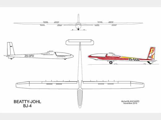 | Histoire résumée | Après quelques modifications le BJ-3 de BEATTY et JOHL devint BJ-3A, puis ensuite avec des transformations plus importantes, le prototype du BJ-4. Un deuxième exemplaire fut construit, financé par Hugh KEARTLAND, dans le but avoué de gagner le championnat du monde 1970, qui devait avoir lieu à Marfa (Texas, USA). Les deux BJ-4 immatriculés ZS-GFD [n° 4 pour ce concours] et ZS-GGS, étaient pilotés par Patrick BEATTY et "Bomber" JACKSON. Mais ces championnats tournèrent au désastre pour les deux pilotes. Pat Beatty fut éliminé dès le premier jour de la compétition, lorsqu'une voiture heurta l'une des ailes de son planeur, alors qu'il était en train d'être démonté après un atterrissage sur une autoroute. Pour comble, le malheureux pilote s'est vu infliger une amende de 150 $ pour son "indiscrétion" (sic). De son côté, JACKSON dut se battre dans l'inattendu petit temps texan (il termina la compétition à la 13e place), et il devint rapidement évident que le BJ-4 n'était pas de taille face aux derniers planeurs allemands en compétition. En 2010, les deux BJ-4 volaient toujours, témoignages d'une ingénierie de qualité et monuments à l'innovation. | ||||||