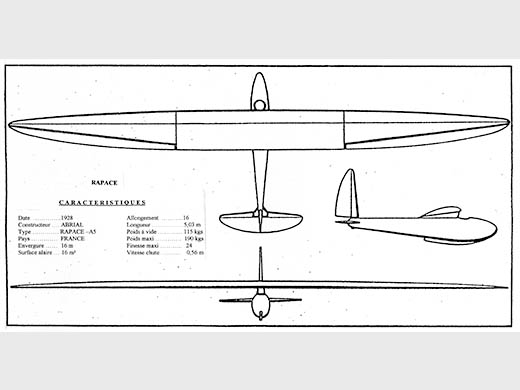 | Infos techniques | Le Rapace présente une ressemblance marquée avec le planeur allemand Darmstadt D-15. Les gouvernes d'empennage sont toutes les deux pendulaires. | ||||||