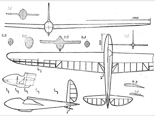 | Infos techniques | Planeur G-2-bis - Son aile cantilever, à mi-hauteur, est divisé en deux moitiés, les cadres attachés à la partie principale du fuselage. La peau extérieure de l'aile et l'aileron entoilés tissu madapolam et emalitom. Fuselage semi-monocoque revêtu de contreplaqué de 2 mm. Verrière en celluloïd transparent (?).Dans le cockpit, on trouve les instruments suivants : indicateur de vitesse, indicateur de vitesse verticale, altimètre, les rouleaux et le pointeur se tourne verrière ouverte (??). Un trait caractéristique de G-2-bis planeur est le patin d'atterrissage pour la première fois équipé d'un dispositif d'amortissement. Stabilisateur horizontal et gouvernail sont tous deux pendulaires avec la particularité d'être de même forme et totalement interchangeables. | ||||||