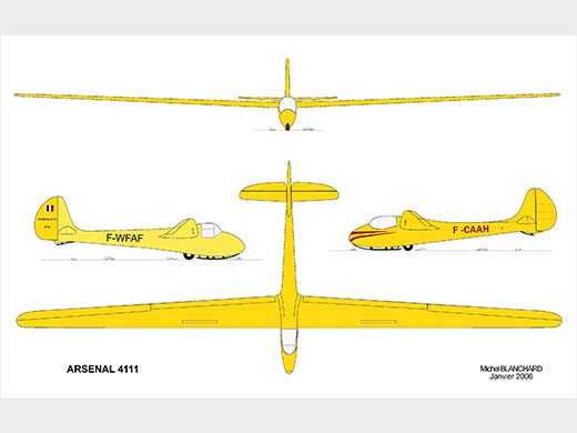 | Livres | Fox Charlie : registre des planeurs français depuis 1952 par CHILLON, Jacques & RAVEL, Christian (2005) [p. 15, 44, 162. Immatriculation + photo]. Vieilles Plumes n° 3 - Les clubs de vol à voile avant 1939 par MARCEAU, Jacques (1994) [p. 22-24. La restauration de l'Arsenal 4111 n° 2, par Marc Weibel. Texte + 2 photos + plan 3 vues]. |