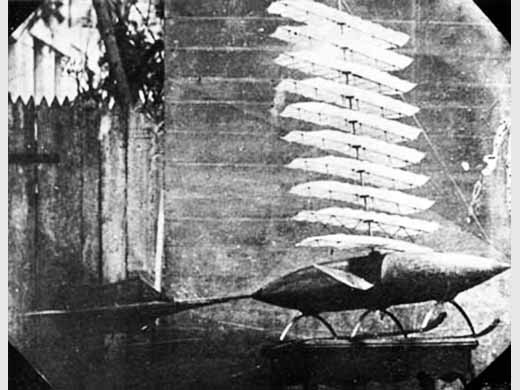 | Histoire résumée | Inventeur prolifique, Charles Renard, militaire de carrière termina sa carrière avec le grade de colonel. Alors qu'il était en garnison à Arras, il expérimente un planeur décaplan à stabilisateur pendulaire "parachute- dirigeable" appelé Aéride, qu'il lance en novembre 1873 du haut d'une tour du Mont Saint Eloi près d'Arras. Ce planeur était destiné au lancement de messages à partir d'un ballon. Renard l'avait muni (dans une deuxième version ?) de part et d'autre du fuselage de deux ailerons actionnés différentiellement par un pendule, dispositif imaginé pour rétablir automatiquement l'équilibre en cas de basculement latéral, mais qui s'avéra inefficace. Le projet n'eut pas de suite. | ||||||