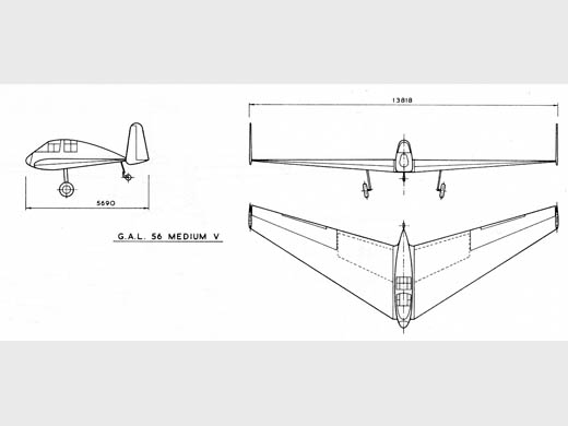 | Histoire résumée | Série de quatre planeurs : - GAL 56/01 Medium V (spécifications et plan 3 vues) - GAL 56/02 Medium U Comme le 56/01 mais avec une petite partie centrale des ailes rectangulaire. Envergure 15,5 m Longueur 6,4 m Surface 41,8 m2 Masse 2540 kg. - GAL 56/03 Medium V Comme le 56/01 mais avec une flèche plus grande (36-40°) Envergure 13,82 m Longueur 7,16 m Masse 2268 kg. - Le quatrième étant le GAL 61. The General Aircraft GAL 56 was a British tail-less swept wing glider design of the 1940s built by General Aircraft Ltd. There were three GAL 56 of different wing form: * Medium-V (TS507) with constant sweep on leading and trailing edges * Medium-U (TS510), with a parallel-chord centre section, * Maximum-V (TS513), with increased sweepback on the quarter-chord line. The first flew in November 1944, the last after the end of the Second World War. They were followed by the GAL.61 intended to be part of the series in a more finished form complete with retracting undercarriage and more of a flying wing but this was never completed and flown. They were flown by pilots at the Royal Aircraft Establishment, Farnborough and by General Aircraft themselves - their test pilot Robert Kronfeld was killed when one of them stalled and crashed. | ||||||