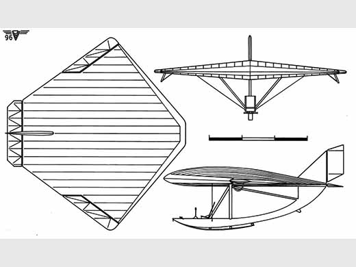 | Infos techniques | Fuselage poutre. L'aile rhomboïdale, équipée d'ailerons, et maintenue par des haubans en bois, permettait des angles d'incidence jusqu'à 35°. Pour les décollages et atterrissages un atterrisseur conventionnel à roues pouvait être monté sur le patin. | ||||||