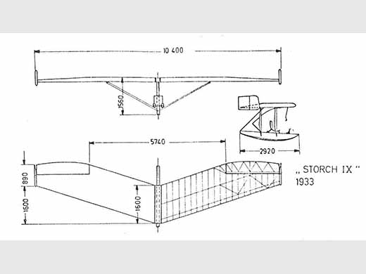 | Autres sources | Alexander Lippisch’ Storch IX, Bill & Bunny Kuhlman, RC Soaring Digest vol. 22 n° 4 avril 2005. Texte + photo + plan 3 vues |
