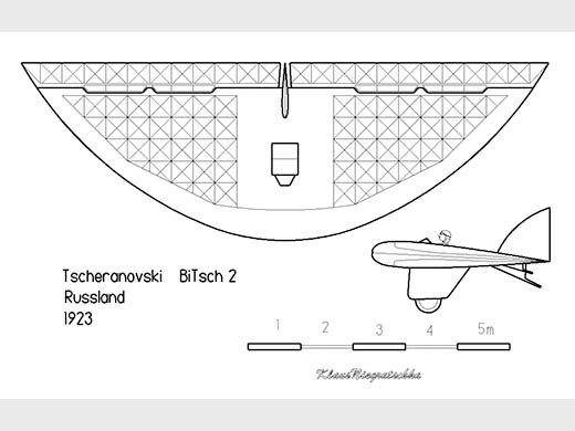 | Histoire résumée | Boris Tcheranovski est connu pour ses conceptions basées sur une aile à géométrie parabolique et la Bich 2 est dans la lignée de la Bitch 1. L'aile a réalisé 27 vols durant le concours de Koktebel (Théodosie, Crimée) en 1924. Cette machine a été motorisée en 1925 sous le nom de Bich 3. | ||||||
