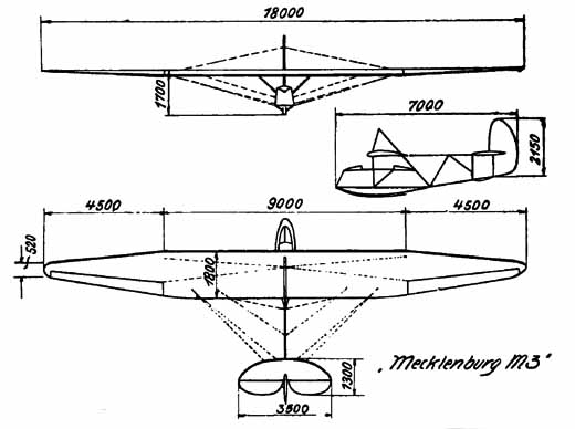 | Histoire résumée | A participé au concours de la Rhön 1929. With the intention of developing this strutted two-seater type still further, the design "Rostock M III" was brought out. With this machine the design of the fuselage and tail of the "M II" were retained in detail and the wing still further developed in the direction of soaring efficiency. The main supporting surface is, on the contrary, braced in the case of the "M III," and is carried out in four sections. The inner wing portions are rectangular in plan form, of two-spar type of construction with rigid wooden diagonals. The outer wing portions, which are attached at the points where the wing is braced, have a trapeziform outline with rounded tips. Both spars meet in a point and in the inner panels are likewise cross-braced with wooden diagonals. The ailerons stretch along the whole length of the outer wing portions. Apart from the wings all other parts are carried out in welded steel tubing construction and are hardly altered as compared with the "M II." As special features this machine possesses ailerons with differential movement and the dihedral angle of the outer wing portions is adjustable. By doubling the aspect-ratio of the "M II" the structural weight of the whole machine was increased to 5.8 kg. per sq. metre, so that this aircraft also can be described as exceptionally light. Furthermore it showed also very good soaring capabilities both as single-seater and as two-seater, and at present is the type best adapted to school purposes. | ||||||