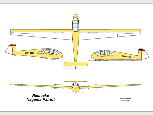 | Histoire résumée | Le Patriot a été dessiné en 1951 sous la direction de l'ingénieur aéronautique Ernst Reinecke, ancien employé de la société Dornier, comme planeur biplace de formation mais aussi de performance. La construction démarre en novembre 1951 dans une salle de la société VEB Nagema, à Schmiedeberg près de Dresde (entreprise de fonderie !) sous les auspices de la FDJ (?) et le premier vol a lieu le 31 mai 1952 à Leizig-Mockau. L’appareil était peint entièrement en jaune, avec le slogan « Défendre la Patrie » („Verteidigt die Heimat“) sous les ailes. A l’issue des vols d’essais, il fut immatriculé DDR-3000. Mais l’appareil n’a pas été produit en série. Le planeur a volé pour la dernière fois en septembre 1953 à Schönhagen, puis fut emmené à l’aérodrome de Laucha (à l'ouest de Leizig) pour quelques tests. Finalement il fut envoyé à l’Université Technique de Dresde pour des essais de résistance à la rupture puis suspendu à un plafond, d’où il tomba : ce fut la fin du seul Patriot construit ! | ||||||