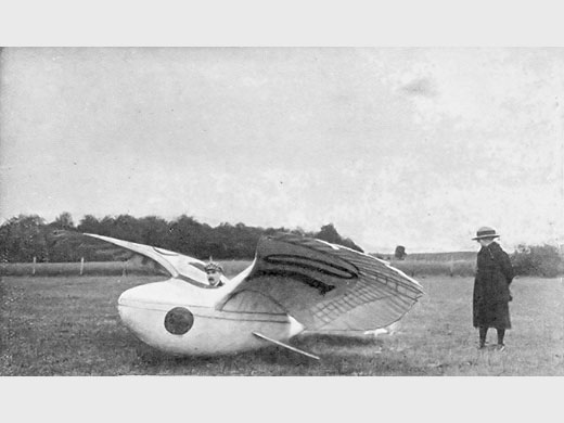 | Infos techniques | Le monoplan Georges Groux est l'application d'une théorie très personnelle sur le vol à voile (théorie sur le vol à voile dynamique). L'extrémité des ailes se termine par des rémiges dont le mouvement d'avant en arrière et inversement est commandé par le pilote. | ||||||