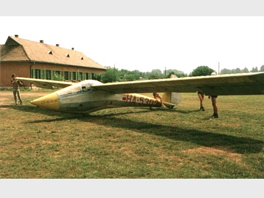 | Histoire résumée | Deuxième prototype du R-26, premier vol en 1961. Le modèle de série sera le R-26 S. In 1958 the MHS, the central organization controlling all flying sports in Hungary, placed an order with the Esztergom Facility of Pest Area Machine Factory (PGE) (formerly Sportárutermelõ V., Esztergom) to design and produce a two-seater glider for basic instruction, a single-seat training and a single-seat standard-class performance glider. The specification called for all-light-metal structures, easy and common maintenance characteristics as well as similar flight characteristics. The concept of the three gliders was based on the - design, production as well as operational - experiences gained with the R-23 Gébics. The design work aimed for as much common assemblies and parts as possible, and for common production technology. The first design, the standard class glider was the R-25 Mokány and the second design was the two-seater for basic instruction, the production version of which got the designation of R-26S and the name of "Góbé" (nickname for a Hungarian from Eastern Transylvania). Two prototypes were built. The structure of the first prototype, the R-26 P1, was similar to that of the R-23 Gébics. The Frise-type ailerons had unusually small area. The front part of the fuselage was covered with light metal sheets as on the Mokány. The landing gear consisted of a spring suspended fixed gear located behind the c.g. of the empty glider, and a nose skid streamlined into the fuselage's bottom. The tail unit had all-flying V surfaces with mass balancing. On the trailing edges of the control surfaces Flettner-type tabs were fitted. To maintain the structural integrity of the wings bat-like airbrakes were fitted on the sides of the fuselage under the wings. This prototype first flew at May 6, 1960. The second prototype, the R-26 P2, had similar wing structure and arrangement as that of the P1 version, however DFS-type airbrakes were fitted working on both surfaces of the wing. The form and structure of the fuselage had got a new form and structure, which was later used on the production version. The tail unit had traditional arrangement. The horizontal surfaces were positioned above the fuselage on the vertical stabilizer to get better spin behavior. The rudder had a large balancing area. The elevator was balanced aerodynamically and had mass-balance as well. This version first flew at August 23, 1961. Both versions underwent a rigorous test and performance measurement program similar to the program applied to the R-25 Mokány. Following the test flights, both versions served at aero clubs to gain operational experiences. Based on the evaluation of these experiences the design of the production version was prepared. The first production glider, which got the designation R-26S, first flew at Jun 6, 1963. Altogether 115 Góbé were produced in Esztergom. Based on this glider a new dual-control instruction system was developed in Hungary, which is in use even today (2004). The production of the R-26S Góbé was closed down at Esztergom. The factory had overhauled R-26S gliders for a couple of years, but in the middle of the 70s even this activity was closed down. In 1981 the XII. AFIT Car Repair Factory at Szombathely established a new workshop and started overhauling R-26S gliders. The factory had modified certain structural elements on the glider to meet European and American requirements and started the production of the modified R-26SU Góbé '82 glider. The first production glider first flew at November, 1982. 78 R-26SU were built of which 61 remained in Hungary, 15 were exported to Cuba, 1 to England and 1 to Austria. The glider is certified for spins. In Hungary the type is in operational use at this writing (2004). | ||||||