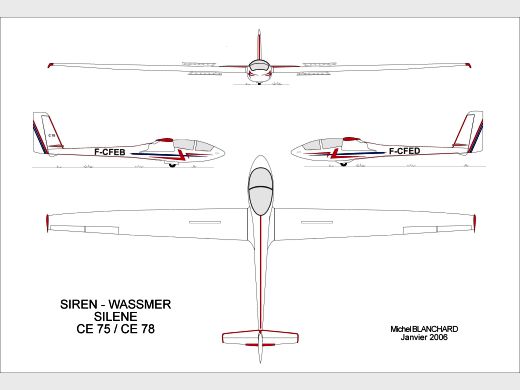 | Histoire résumée | Prototype de planeur biplace côte à côte avec sièges décalés développé dans le cadre du CERVA (Consortium Européen de Réalisations et de Ventes d'Avions, Groupement d’intérêt économique constitué par WASSMER et SIREN) par Philippe Moniot. Premier vol en juillet 1974. Cette machine est, avec le Schempp Hirth « Janus », le premier planeur biplace «plastique». Nombre d’exemplaires construits : 1 prototype CN 01 (F-CCFF) et une cellule CN 02 pour essais statiques Appareil faisant partie de la collection de Philippe Moniot. Le CE 75 connaitra en fait, après la disparition de WASSMER et CERVA, le développement d’une petite série sous l’appellation de E 78 « Silène », fabriqué par ISSOIRE AVIATION. | ||||||