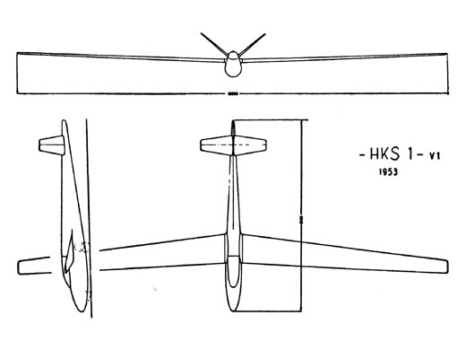 Histoire résuméeTrois types de planeurs HKS ont été construits. Le HKS 1/V1 fut le premier. Il mérite de retenir notre attention car il incarne l'une des principales directions de développement qui se soient manifestées depuis la 2ème guerre mondiale. Inspiré du travail de Raspet dur le RJ-5 et d'autres développements nouveaux. Kensche entreprit de construire un planeur pour la haute vitesse et les vols expérimentaux. Il choisit une grande charge alaire de 35 kg/m2 et, pour avoir un angle de plané suffisamment plat, il s'efforcera de conserver l'écoulement laminaire sur la plus grande partie de l'aile. D'autre part, il réduisit la résistance nuisible. Outre les petites améliorations, telles que celles que Raspet avait aussi employées, il donna au planeur des gouvernes papillon pour réduire les perturbations et la superficie. D'autre part les ailes ne possèdent ni ailerons, ni volets, ni freins. Rien n'interrompt la face supérieur de l'aile; quant à la face inférieure, elle n'est interrompue qu'à 70% de la corde par le mécanisme de gauchissement formant une étroite fente. Le gauchissement des ailes n'assure pas seulement le pilotage latéral, il change la courbure de l'aile elle-même. L'aile forme une flèche de 4 degrés vers l'avant, de sorte que le pilote se trouve au centre de gravité tout en gardant une bonne visibilité.