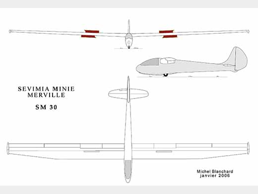 | Histoire résumée | Projet étudié par Raymond JARLAUD, qui travaillait à la SEVIMIA depuis le printemps 1949. La construction a été confiée à la société Merville. Le SM-30 a effectué son premier vol le 2 juillet 1957. Merville était initialement une société de construction d'hélices fondée en 1919. Mais elle a ultérieurement construit des planeurs (dont des Emouchet SA-103, outre les SM-30 et 31). |