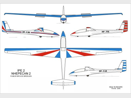 | Histoire résumée | Modèle de série (désigné IPE 02B Nhapecan II) du prototype IPE 02 Nhapecan qui avait effectué son premier vol à Bauru, São Paulo le 24 mai 1979. Ce prototype fut soumis à de longues campagnes d'essais qui conduisirent le constructeur à introduire de nombreux changements visant à améliorer ses performances et à répondre à certaines exigences du Ministère de l’Air (changement du profil des ailes, envergure 16,6 m, changements structurels, ajout d’un lest fixe). Finalement l'IPE 02B Nhapecan II, effectua son premier vol en 1983 et fut homologué en 1986. Il est aussi probable que les essais et la mise en production aient été ralentis par la production du Quero Quero par l'IPE. Cette machine fut un succès au Brésil et est utilisée dans de nombreux clubs de ce pays. | ||||||