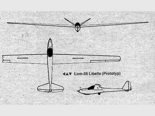 | Histoire résumée | Le prototype V-1 du Lom-55 Libelle a été dessiné à partir du projet Lo-55. Premier vol le 13 février 1957 (pilote d'essais Karl TREUTER). Mais les essais n'ont pas été concluants. Un second prototype a été construit (Lom-55 V2 Libelle, avec empennage en V) et a servi a des essais statiques. | ||||||