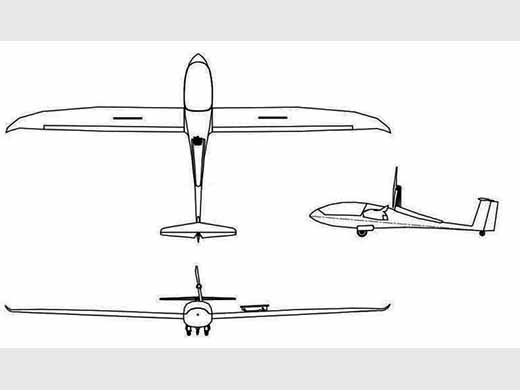 | Infos techniques | Empennage en T. Motoplaneur électrique : moteur 30 kW, accus Lipo de 47 kg et 6 kWh. Moteur sur pylône rétractable. Hélice tractrive. | ||||||