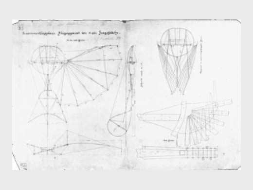 | Infos techniques | Envergure de 6,6 ou 7 m, selon le dessin auquel on se réfère. Cet appareil correspond aux brevets allemand 77916 (03/09/1893)) et US 544816 (du 20/08/1895 déposé par Lilienthal le 24/02/1894). Les ailes de l'appareil pouvaient se replier, dimensions replié : 2,0 m x 3,2 m x 0,5 m. | ||||||