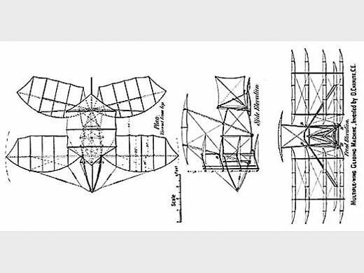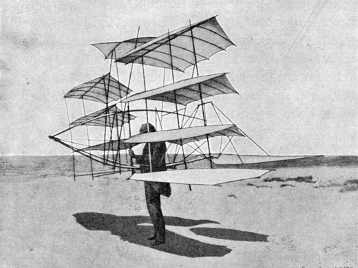 | Histoire résumée | La machine, aussi appelée "Machine à ailes multiples", construite au printemps de 1896 a subi d'importantes modifications durant une première période d'essais (juin 1896), dans les dunes de Miller Beach, sur la rive sud du lac Michigan, près de Chicago. Puis en août, et au même endroit, une nouvelle configuration de la machine fut testée (en parallèle avec deux autres planeurs construits en collaboration avec Augustus HERRING et William AVERY). De nombreuses glissades ont été effectuées, montrant la viabilité du principe de l'aile mobile. | ||||||