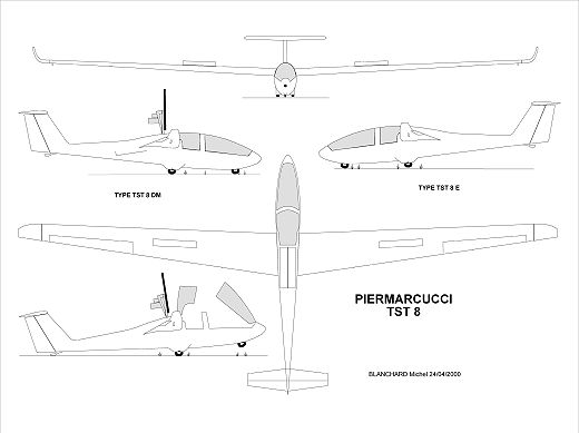 | Infos techniques | Version motorisée du TST-8 E. Moteur sur pylône rétractable. Moteur Rotax 503 (46 CV). Vitesse ascensionnelle à pleine charge 120 m/min. Atterrisseur à 2 roues et roulette avant fixes. Empennage en T. | ||||||