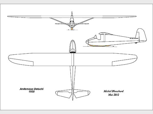 | Histoire résumée | Dessiné par A.J. ANDERSSON, le Datschi fut construit par le "Augsburger Verein für Luftfahrt" à Augsburg. Son nom vient d'un gâteau local appelé "Zwetschgendatschi". Le planeur participa au concours régional bavarois à Hesselberg en 1930, puis au concours de la Rhön à la Wasserkuppe en juillet-août 1931. |