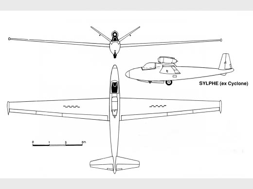 | Histoire résumée | En 1949, Joseph Szydlowsky, fondateur de la société Turboméca, s'adresse au Département aéronautique Fouga pour trouver une cellule susceptible d'accueillir un petit turbopropulseur qu'il est en train de mettre au point. La rencontre avec Fouga aboutit à la décision de tester ce moteur sur les planeurs CM-8/13 ou 8/15 que R. Castello et P. Mauboussin venaient de mettre au point (Robert Castello et Pierre Mauboussin étaient respectivement Directeur technique des Ets Fouga, et Directeur des services aviation, et travaillaient en étroite collaboration). Fin 1948, Turboméca annonce les caractéristiques du moteur appelé "Piméné" : 40 cm de diamètre, 42 kg pour 820 N de poussée. Robert Castello adapte facilement ce petit propulseur au fuselage du CM-8/15 (à empennage en Vé rappelons-le). Les performances des voilures des CM-8/13 (13 m L'appareil sera appelé CM-8R13 Cyclone, mais après les premiers vols il sera rebaptisé Sylphe(à la demande expresse de la Société Wright Corp. qui construisait un moteur très connu appelé Cyclone), et sa dénomination définitive deviendra CM 8.R13 Sylphe I. En avril 1949, une machine bricolée à partir du fuselage de CM-8/15 et des ailes du CM-8/13 est présenté au salon de l'aéronautique du Grand Palais, vitrine mondiale de l'aviation. Après le salon les éléments propres au Cyclone sont construits : fuselage de 8/15 avec l'avant allongé et intégration du réacteur sur une cabane, voilure de 8/13 avec volets hypersustentateurs et aérofreins améliorés. Les premiers vols du premier planeur motorisé par un réacteur à avoir volé au monde eurent lieu le 14 juillet 1949 (Léon Bourriau, pilote d'essais de Fouga Aviation aux commandes), l'appareil n'étant pas encore peint et le réacteur n'ayant pas reçu son capot ! F-WFOI [F-BFOI] n°1 : a beaucoup volé en essais et présentations dans divers pays. Ensuite il est affecté à Saint-Yan et démotorisé en 1954 à la demande du S.A.L.S. : il devient un planeur CM-8/13 mais avec empennage papillon. F-WFOJ [F-BFOJ] n°2 : un certain nombre d'évolutions sont perceptibles entre ces deux appareils. On remarquera en particulier la roulette fixée sur le patin avant dans le cas du n°2, ou intégré au patin dans celui du n°1. Le carénage moteur a lui aussi évolué. | ||||||