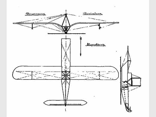 | Infos techniques | Formule canard à ailes médianes. Corde d'aile 2 mètres. Derrière l'aile, le fuselage se prolongeait par une surface de guidage ou d'amortissement horizontale. Au-dessus de cette surface se trouvait plus tard la commande latérale verticale, qui manquait lors des premiers vols. Les deux cinquièmes extérieurs de l'aile étaient gauchissables, la commande étant notre commande à roue militaire normale actuelle. Pour éliminer au maximum la résistance de mon corps, je me suis mis en position couchée dans le fuselage, sur une large sangle sous les aisselles et au-dessus des genoux. Les pieds s'appuyaient sur une barre transversale, puis sur le levier de commande latérale. Une tringlerie avec un levier coudé allait vers la commande de profondeur à l'intérieur du fuselage. Sous mes yeux, le fuselage était pourvu de fenêtres en celluloïd. | ||||||
